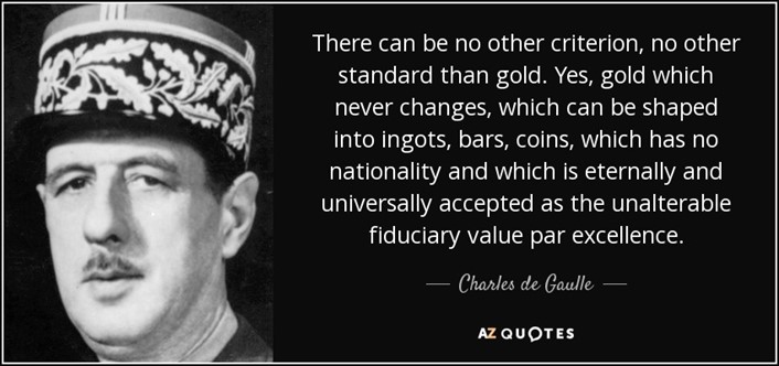 "There can be no other criterion, no other standard than gold. Yes, gold which never changes, which can be shaped into ingots, bars, coins, which has no nationality and which is eternally and universally accepted as the unalterable fiduciary value par excellence"