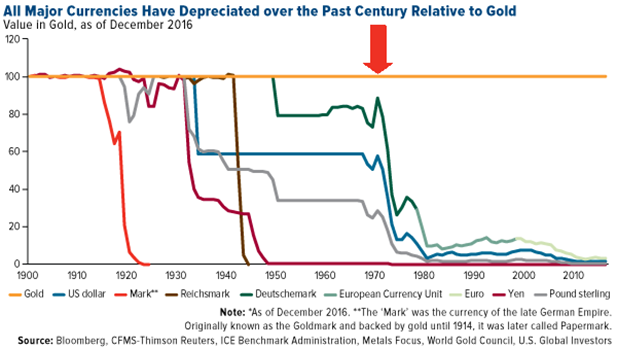 Verdens største valutaer har siden 1971 tapt seg markant mot gull.