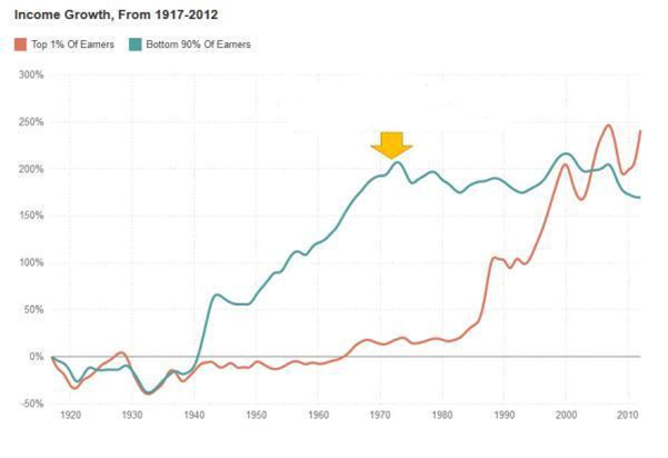 Nedenfor viser vi noen utvalgte grafer som peker på at endringen av det monetære systemet i 1971 har hatt vidtrekkende konsekvenser. Det skjedde noe vesentlig i 1971 – samtlige illustrasjoner peker på det. Grafene gjelder USA.