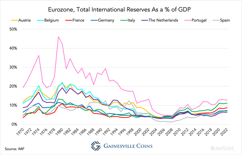 In my latest article on this subject—“Europe Has Been Preparing a Global Gold Standard Since the 1970s. Part 2”—I have demonstrated that central banks of medium and large economies in the eurozone have balanced their official gold reserves, proportionally to GDP, to prepare for a gold standard (/gold price targeting system). My analysis was pieced together by scarce quotes from central banks and data of European gold and foreign exchange holdings. My conclusion was that several medium-size economies in Europe (the Netherlands, Belgium, Austria, and Portugal) sold large amounts of gold from the early 1990s to 2008 to come on par with France, Germany, and Italy. I wrote: