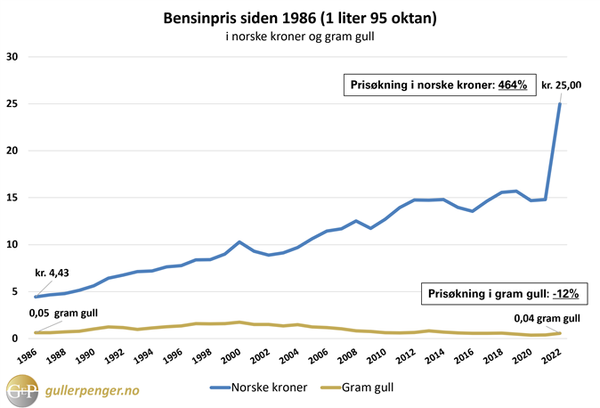 Grafen nedenfor viser at bensinprisen målt i gram gull har holdt seg noenlunde stabil siden 1986. Faktisk har gulls kjøpekraft økt i perioden; man får 12% mer bensin for ett gram gull i dag sammenlignet med 1986. Det kalles deflasjon, at penger blir mer verdt (og ikke mindre).