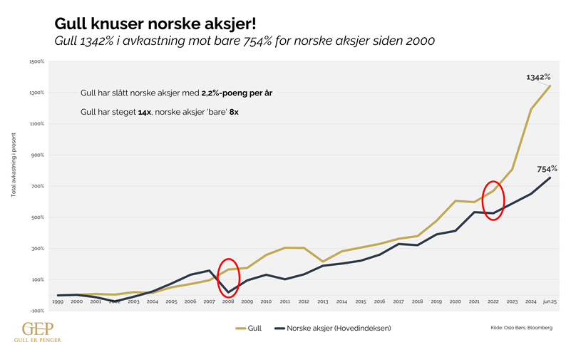 Grafen illustrerer utviklingen fra slutten av 1999 frem til juni 2025, med gull vist i en gyllen linje som jevnt og trutt klatrer oppover, mens den mørkeblå linjen for norske aksjer viser større svingninger. Over tid har gull slått norske aksjer med gjennomsnittlig 2,2 prosentpoeng per år – en forskjell som akkumuleres til en enorm fordel.