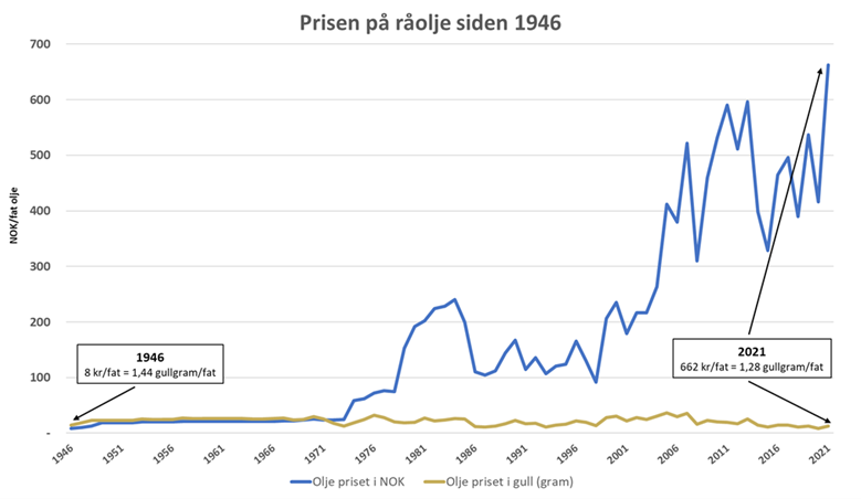 Et fat olje er det samme da som nå, en uendret enhet av den samme råvaren. Ett gram gull har heller ikke forandret seg. Det har imidlertid den norske kronen, den har tapt kjøpekraft. Prisen i norske kroner var forholdsvis stabil fram til 1971. Deretter har oljeprisen steget kraftig i norske kroner. Prisen på et fat olje i norske kroner har steget hele 83 ganger siden 1946.