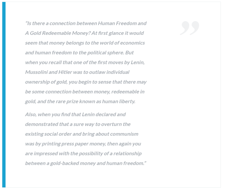 The outlawing of gold in 1933 by President Roosevelt was the keystone of the Progressive movement to undo the American system of government. A justice of the Supreme Court at the time stated: “The Constitution as we know it is gone.”