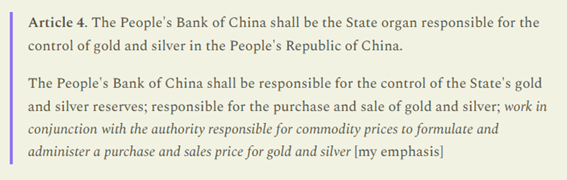 I denne sammenhengen, de opprinnelige 1983-forskriftene om kontroll av gull og sølv (Regulations on the Control of Gold and Silver) som utnevner Peoples Bank of China uttrykker: