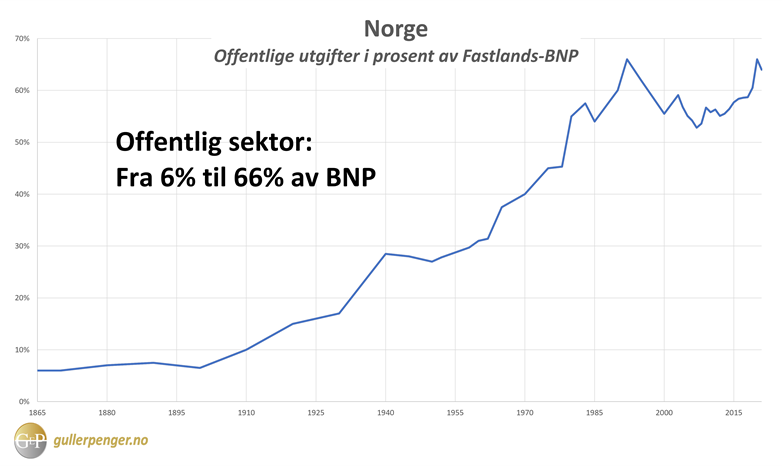 De store vinnerne i inflasjonspolitikken er staten og de superrike. I Norge har offentlig sektor vokst fra å bruke 6% av BNP i 1900 til 66% i 2020. Dette er ikke bærekraftig. Det er økonomisk katastrofe og en trussel mot demokratiet.