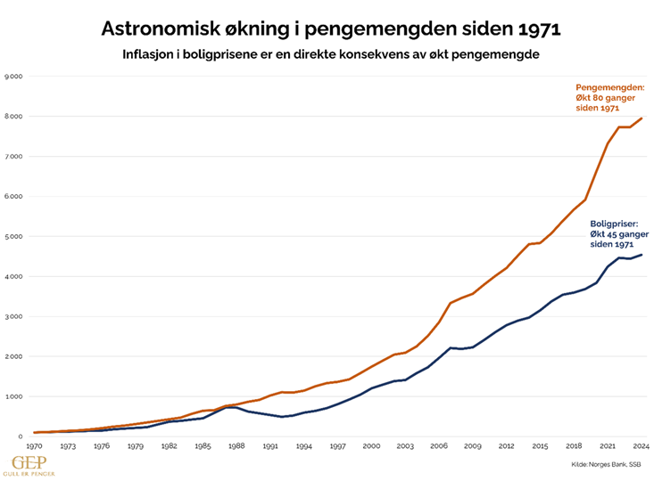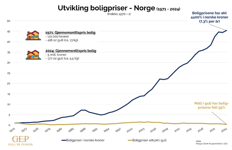 Forestill deg at vi er på en gullstandard. Du kan enten betale direkte med enheter i gull eller via norske kroner knyttet til gull. En bolig ville i 1971 kostet 13 kg gull, mens den i 2024 bare ville kostet 5,5 kg.