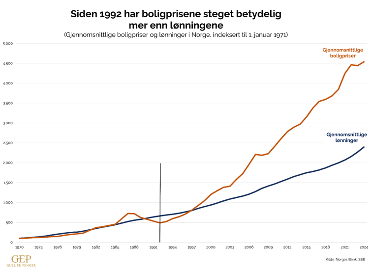 Siden 1992 har boligprisene i Norge steget betydelig mer enn lønningene. Fra 1971 og frem til i dag har gjennomsnittlige boligpriser skutt i været, mens lønningene har hatt en langt mer moderat vekst. Resultatet er at boligdrømmen for mange nordmenn blir stadig dyrere å realisere.
