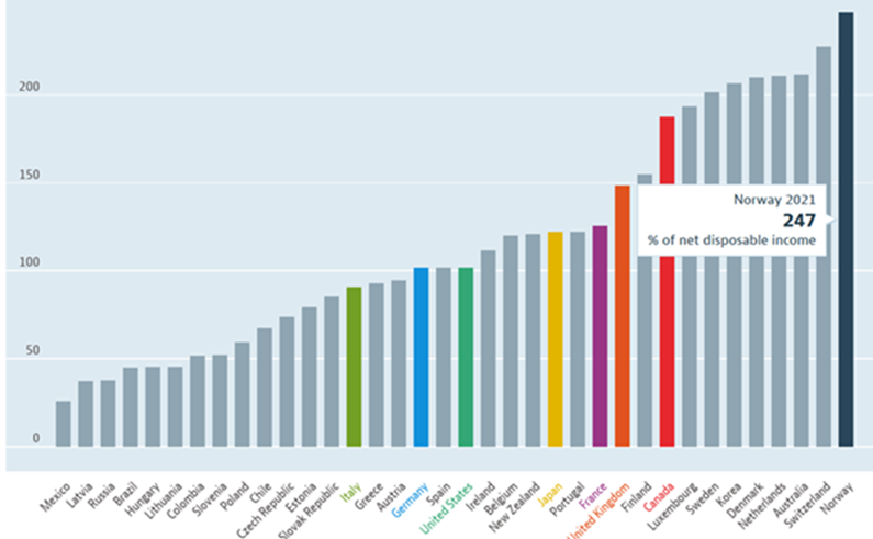 Private husholdninger i Norge har mest gjeld i verden, målt mot disponibel inntekt (etter skatt), se graf.