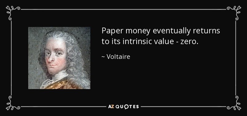 Fiat-penger er selvfølgelig ikke et nytt fenomen. Voltaire uttalte allerede i 1729 at papirpenger alltid har en forutsigbart over seg. De vil til slutt nå papirlappens faktiske verdi, nemlig null.