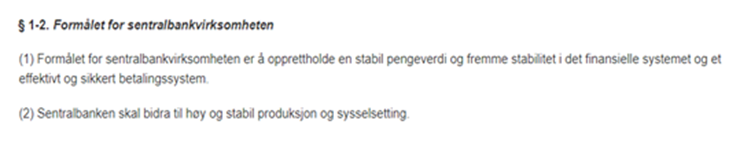 ‘Formålet med sentralbankvirksomheten er å opprettholde en stabil pengeverdi…’.