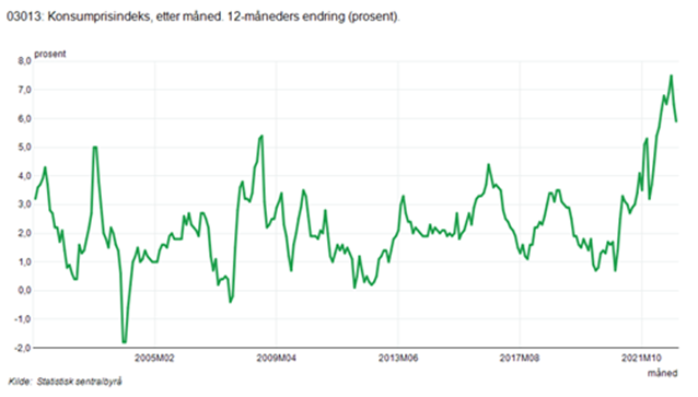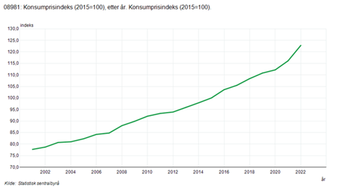 Resultatet av en gjennomsnittlig årlig inflasjon på 2,2% p.a. vises gjennom konsumprisindeksen nedenfor. I sum har inflasjonen vært 58% fra 2001 til 2022. Dette er tap av kjøpekraft. Og dette er i høyeste grad en ustabil pengeverdi. Det er ingen ting ved en kontinuerlig stigende konsumprisindeks som tilsier at pengeverdien er stabil.