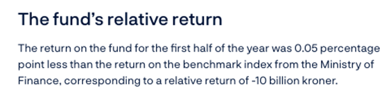 Oljefondet oppnådde en hederlig avkastning på 5,72% i fondets valutakurv (blanding av USD, EUR osv.). Det er imidlertid 0,05%-poeng dårligere enn fondets referanseindeks (som de over tid skal slå for å vise at den aktive forvaltningen lønner seg).