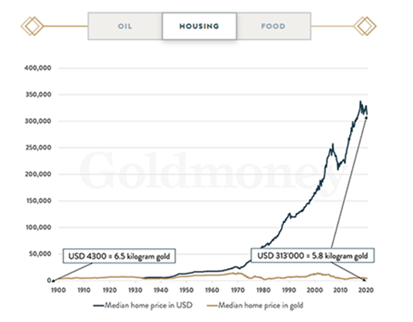 I USA kunne man rundt år 1900 kjøpe en bolig for 4.300,- dollar, tilsvarende 6,5 kg gull. I 2020 kostet til sammenligning en bolig 313.000,- dollar, eller 5,8 kg gull. Den nominelle prisen på en bolig i USA har altså steget 73 ganger i perioden. Prisen på en bolig i USA målt i gull er imidlertid tilnærmet uendret. Gullprisen har med andre ord kompensert for prisøkningen på en bolig målt i dollar. Se graf under.