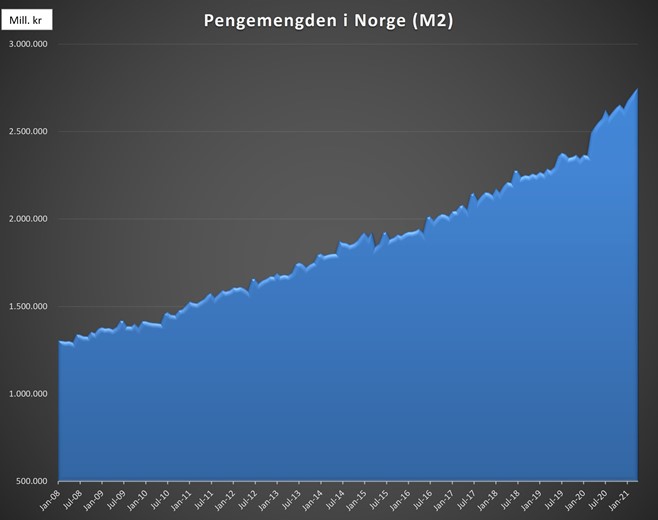 Pengemengden (det vanligste målet på pengemengde heter M2) i Norge økte med ca. 9% siste 12 måneder (per april -21). Gitt en årlig veksttakt på 9% vil pengemengden i Norge doble seg hvert 8. år!