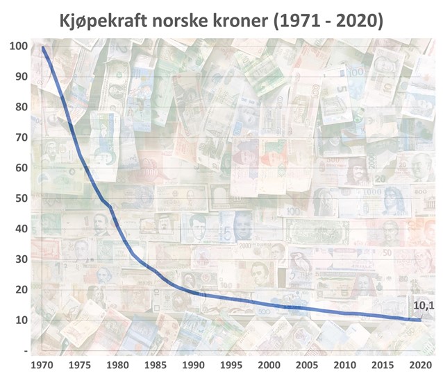 Den norske kronen har med andre ord bare 10% av sin kjøpekraft igjen. Sagt på en annen måte, for 100 kroner i dag får du bare kjøpt 1/10 sammenlignet med 1971. Går vi enda lenger tilbake (f. eks. 1927) ser vi at norske kroner kun har 2% igjen av sin kjøpekraft (men det får bli en annen blogg…).